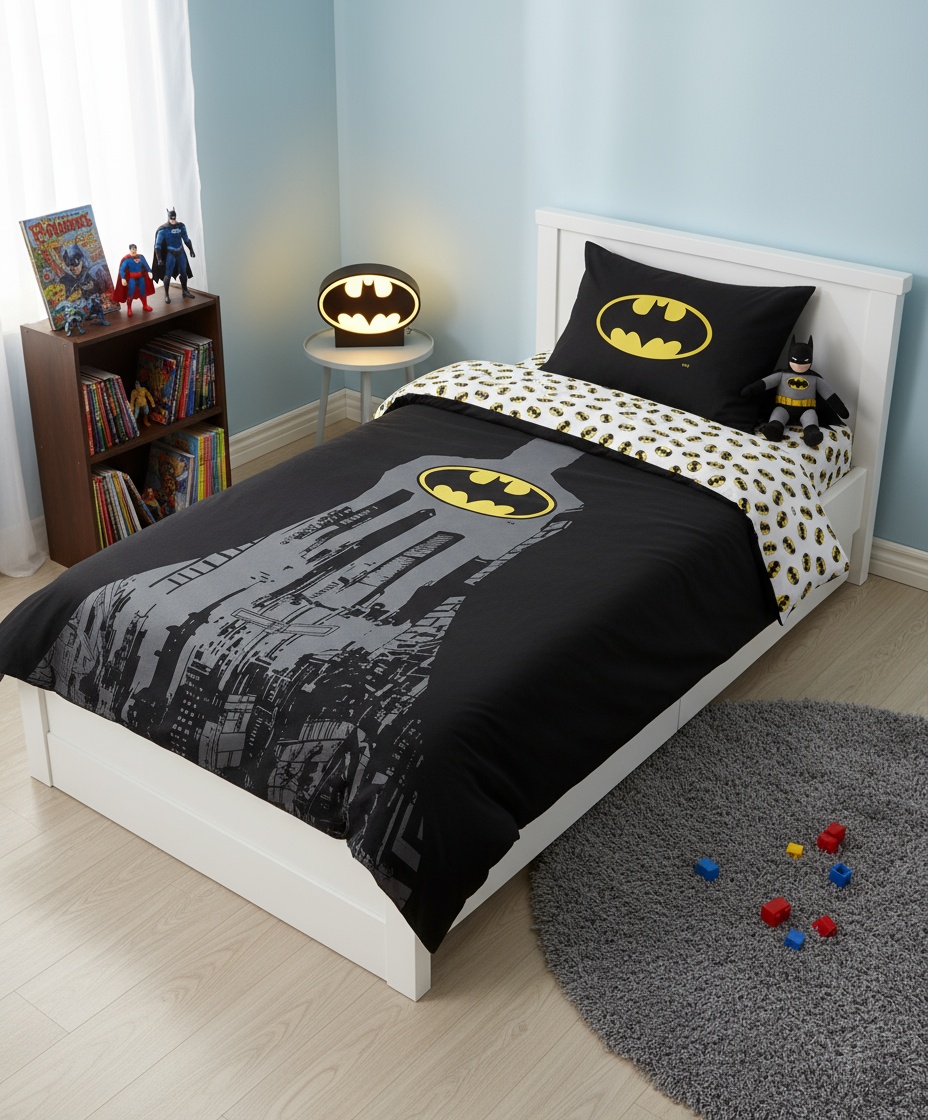 Dette er ikke bare et hvilket som helst sengesæt. Det er officielt Batman sengetøj, hvilket betyder, at du får den ægte vare. Det bløde og behagelige materiale sikrer, at dit barn sover trygt og godt hele natten. Og med målene 140×200 cm passer det perfekt til en standard juniordyne. Pudebetrækket måler 65×65 cm. Det komplette sæt består af et dynebetræk og et pudebetræk, alt hvad du skal bruge for at redde en god nattesøvn.