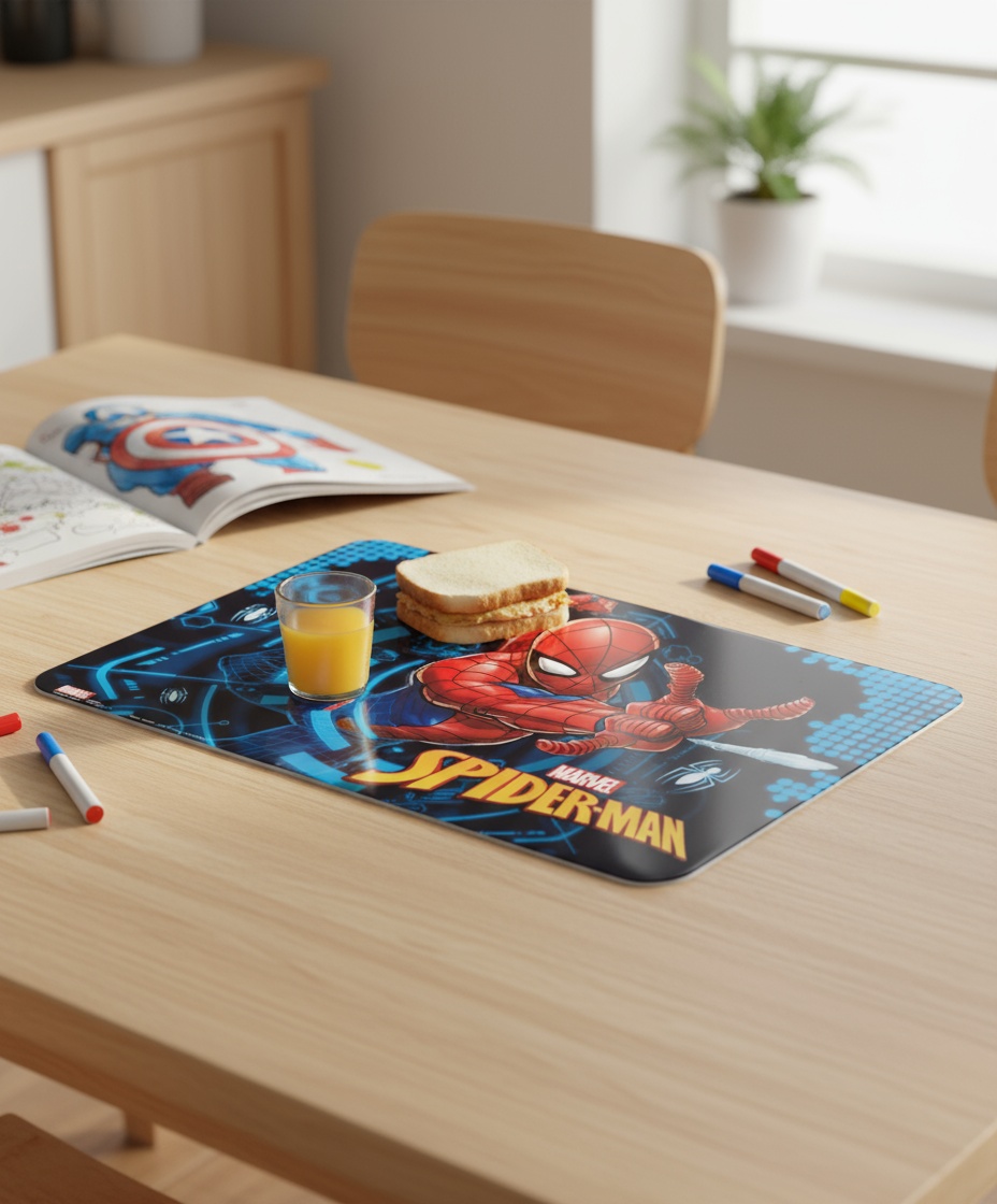 Dette bordunderlag, baseret på den elskede Marvel børneserie, er fremstillet i plast, hvilket gør det let at rengøre og robust nok til daglig brug. “Holder det til min lille superhelt?” Med Spiderman ved din side, er alt muligt!