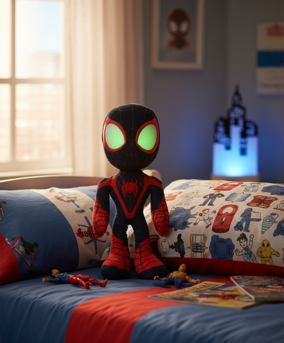 Denne 25 cm høje bamse, baseret på karakteren Spiderman / Miles Morales, er ikke kun en blød krammeven, men også en superhelt, der venter på at blive dit barns sidekick i deres daglige eventyr. De lysende øjne er designet til at skabe en følelse af tryghed, når lyset slukkes, og helteeventyrene fortsætter ind i drømmeland.