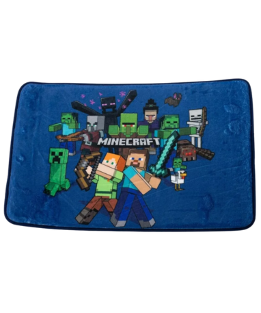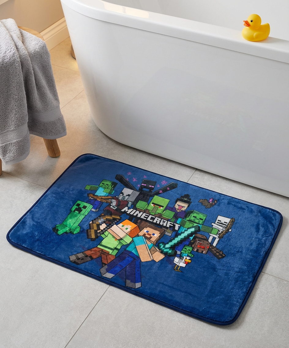 - Design: Blå bademåtte med et “Battle” motiv, der viser forskellige karakterer fra Minecraft-universet.