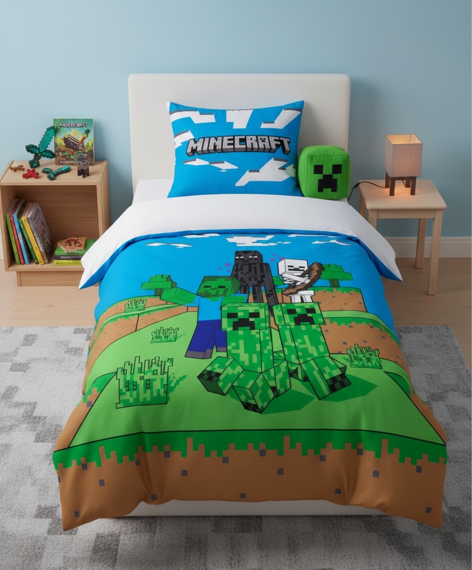 Er det svært at få barnet til at falde til ro om aftenen? Med dette Minecraft sengetøj kan sengetid blive en del af legen. Barnet kan forestille sig, at de selv er en del af Minecraft-verdenen, og måske endda drømme om at bygge fantastiske konstruktioner eller udforske endeløse landskaber. Dette sæt er mere end bare sengetøj; det er en portal til en verden af fantasi og eventyr. Du kan finde et stort udvalg af Minecraft merchandise der kan skabe et tema på værelset. Måske en Minecraft lampe, eller legetøj fra spillet?