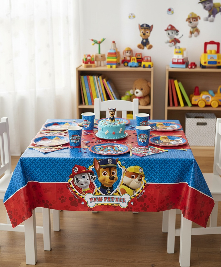 Paw Patrol borddugen måler 120×180 cm og er dekoreret med de elskede Paw Patrol figurer som Chase, Marshall og Rubble. Den er designet til at passe perfekt på de fleste borde og vil straks tilføje et festligt touch til din fest. Denne borddug er lavet af holdbart materiale, som er nemt at rengøre, hvilket gør oprydningen efter festen hurtig og enkel.