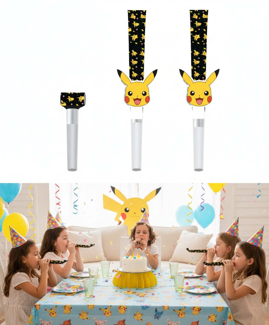 Planlægger du en uforglemmelig fødselsdag for dit barn eller barnebarn, som elsker Pokémon universet? Så ved du, hvor vigtige de små detaljer er for at skabe den helt rigtige stemning. Forestil dig børnenes begejstring, når de opdager disse seje Pokémon festblæsere ved deres plads! Pakken indeholder 8 festlige blæsere, klar til at sætte gang i festen. Fire af dem har et charmerende design med Pikachus glade ansigt og ikoniske gule ører, mens de andre fire er dekoreret som klassiske Pokéballs i rødt og hvidt. Med en længde på 30 cm er de nemme for små hænder at håndtere og skaber masser af sjov og ballade.