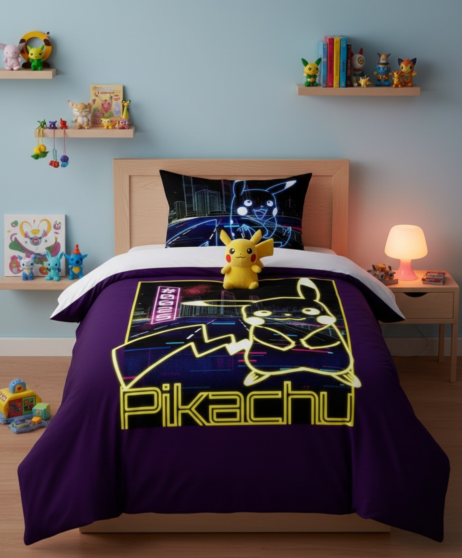 Sengetøjet er prydet med et levende, neongrønt design, hvor Pikachu, den mest elskede af alle Pokémons, løber og leger omgivet af stjerner og lyn. De elektriske udladninger fra Pikachu, symboliseret ved gule lyn, tilføjer en ekstra dimension af spænding til designet. Sengetøjets baggrund udgør et mønster af Pokémons i forskellige positurer, hvilket skaber en følelse af bevægelse og eventyr. Dette Pokemon sengetøj er ikke bare en del af børneværelsets dekoration; det er en invitation til drømmeland, hvor eventyr med yndlingsfigurerne venter.