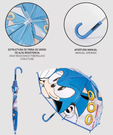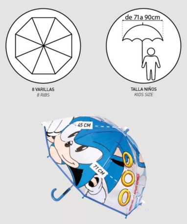 Denne officielt licenserede Sonic paraply er designet til at lyse op selv den mørkeste dag. Med farverige illustrationer af verdens hurtigste pindsvin, vil dit barn se frem til regnvejrsdage for at kunne svinge denne paraply på vej til skole eller under leg i parken.
