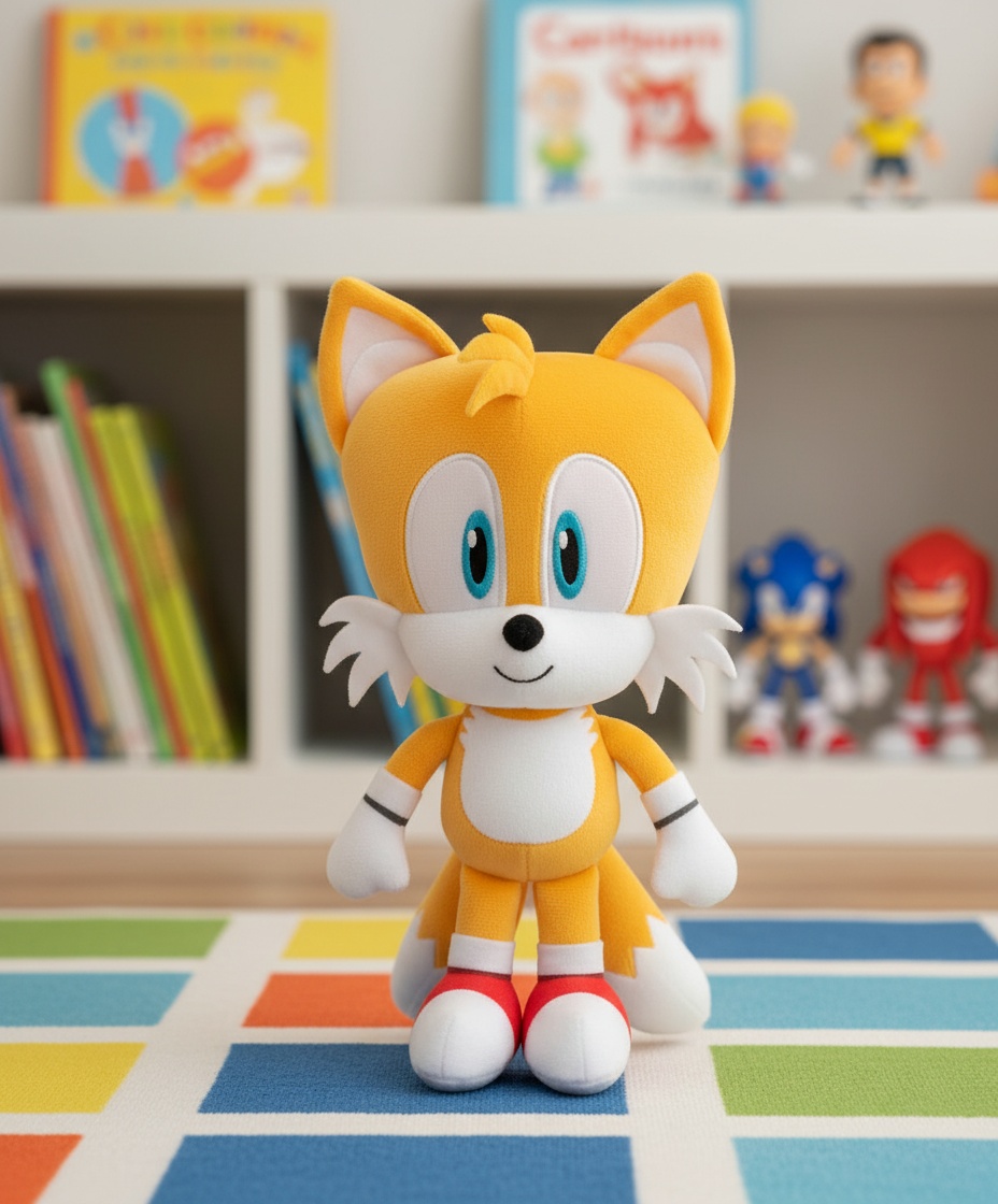 Her er Tails, den superhurtige ræv med de to haler, kendt fra Sonic The Hedgehog universet. Denne Tails bamse er 20 cm høj – lige til at kramme. Hans glade ansigt med de store øjne og den velkendte gule farve gør ham nem at genkende. De to karakteristiske haler sidder klar bag ham, som om han er klar til at flyve væk med det samme. Han ser blød og indbydende ud, klar til at blive en del af barnets hverdag.