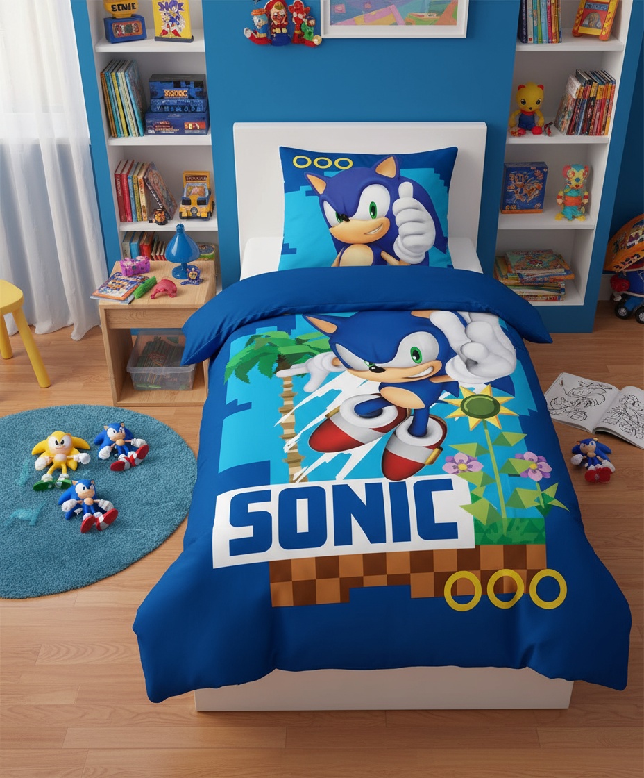 Dette officielt licenserede soveværelsessæt indeholder et dynebetræk og et pudebetræk, der hver især er prydet med levende og farverig grafik af alles yndlings blå pindsvin. Materialet er fremstillet af 100 % mikrofiber og er blødt og behageligt, perfekt til at hygge sig i sengen.