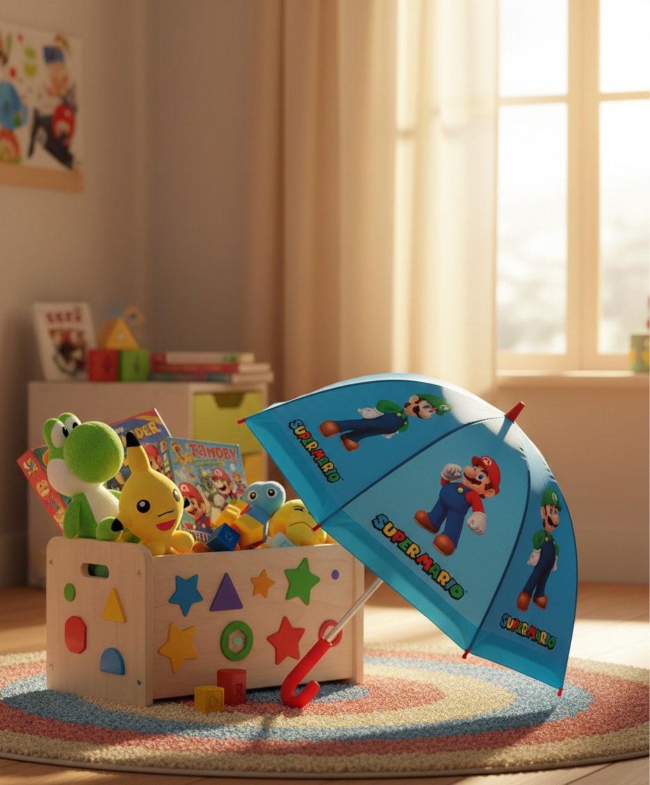Er regnvejr en kedsommelig affære derhjemme? Ikke mere! Med denne fantastiske Super Mario paraply bliver det pludselig sjovt at gå ud. Det er den perfekte gave til de små eventyrere. Designet er inspireret af Super Mario merchandise, hvilket giver hverdagen et strejf af leg og eventyr.